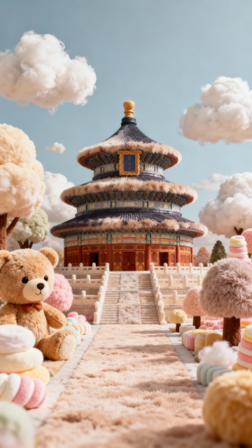 宏大的场景,天坛及其周边环境完全转化为一个毛绒绒的柔软乐园。建筑本身由蓬松的泰迪熊材质制成,屋顶是长毛绒,街道是柔软的短绒地毯。周围的树木是巨大的棉花糖和羊毛毡,云朵是蓬松的棉絮。画面突出建筑物,整个画面充满温暖、梦幻的童话感,色彩柔和,光线温馨。超现实主义,8K分辨率,细节极致,竖版16:9。