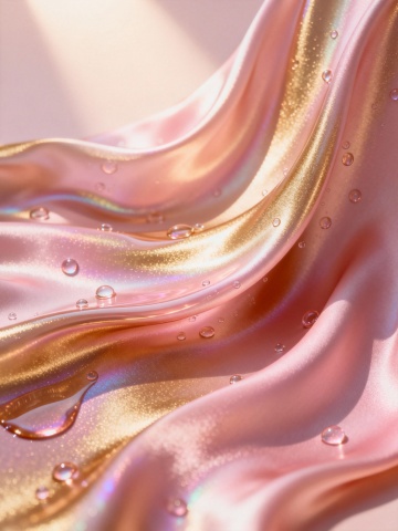 精致的3D渲染画面,主体为流动感十足的粉金色液态绸缎,呈现出柔和的波浪形态,表面光滑细腻且带有强烈的金属光泽与高光反射,绸缎间点缀着细小的水珠与气泡,悬浮于画面各处,整体色调以浅粉与香槟金为主,营造出奢华、梦幻且具有视觉张力的氛围,光线从上方柔和洒下,形成自然的明暗过渡与层次感,构图饱满,充满动态韵律,无任何文字元素。
