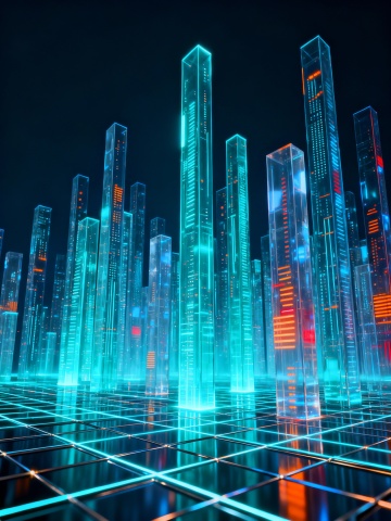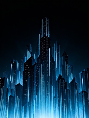 深邃幽暗的数字空间中,由无数蓝色发光像素和线条构成的高耸建筑林立两侧,形成充满未来感的隧道般纵深构图,光线从远方中央明亮处向四周辐射,营造出强烈的科技感和速度感,建筑边缘和光线轨迹上点缀着闪烁的电流状蓝色电光,呈现出细微的跳跃和流动效果,整体色调以深蓝和亮蓝为主,光影对比鲜明,充满神秘而先进的数字科技氛围。