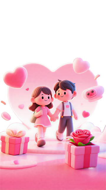 软3D风卡通情侣,手牵手微笑,粉色心形与蝴蝶结环绕,营造可爱浪漫氛围。