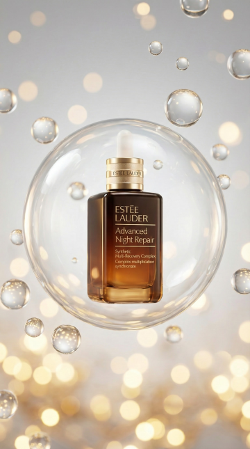 梦幻雪夜中,修护精华披上粉色毛衣,拟人化设计融合温馨与甜美,轻拟物风营造节日氛围,面料质感与毛发生长细节呼应冬日温暖。