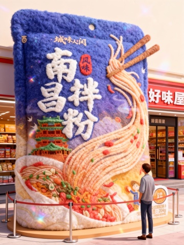 把图片产品做成充满创意和梦幻色彩的绘本风格的巨型毛毡艺术卡通风格雕塑放置在画面中心(产品的包装保持不变),人物站在一旁欣赏(与巨型产品形成比例反差),围栏隔离展示,背景是零食店门口