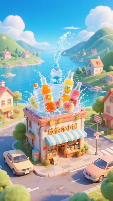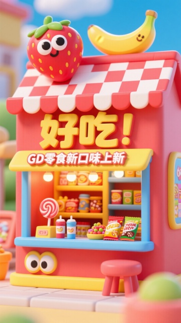 把图片产品做成充满创意和梦幻色彩的绘本风格的巨型毛毡艺术卡通风格雕塑放置在画面中心(产品的包装保持不变),人物站在一旁欣赏(与巨型产品形成比例反差),围栏隔离展示,背景是“好味屋”零食店门口
