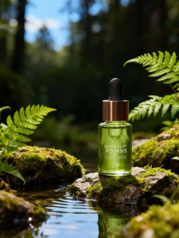 静谧溪流中悬浮的修护精华,重拟物风结合玻璃质感,液态涟漪映衬自然绿意,清透与奢华交织,传递优雅清新之境。