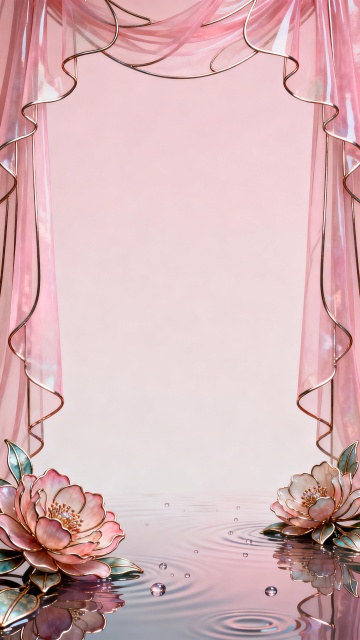 柔和的粉色渐变背景,画面中央有透明飘逸的掐丝珐琅丝带以优雅的曲线环绕,丝带边缘有精致的金色掐丝线条勾勒,呈现出半透明的珐琅质感;左下角和右下角各有一朵盛开的掐丝珐琅花朵,花瓣以粉色珐琅填充,花蕊点缀金色掐丝,花茎和叶子也由金色掐丝构成,叶片上有细腻的纹理;水面平静如镜,倒映着丝带和花朵的影子,水面上有几颗晶莹的珐琅水珠,水珠周围泛起一圈圈涟漪,整体画面营造出轻盈、梦幻、精致的氛围,光影柔和,高光处有细腻的光泽感,整体风格保持一致的柔和粉色调与掐丝珐琅的精致工艺感。