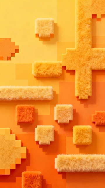 一个充满梦幻可爱氛围的像素毛毡材质房间,柔和的粉紫色墙壁搭配鹅黄色装饰线条,角落里有一个黄色的小沙发和粉色的小凳子,房间中央是一个粉色的圆形平台,地面上散落着几个彩色的毛毡小球,窗边的架子上摆放着蓝白相间的小房子摆件,墙上挂着黄色边框的装饰画,整体采用低多边形像素化毛毡质感,光线柔和温暖,营造出甜美温馨的童话空间感。
