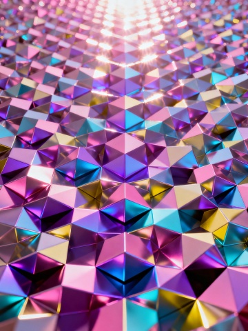 梦幻感十足的镭射质感背景,由大量不规则多边形几何色块组成,整体呈现出以蓝紫色为基调,融合粉绿、淡金、幻彩等光泽的渐变色彩效果,每个多边形色块边缘锐利清晰,表面反射着如同彩虹般流动变幻的镭射光芒,光影交织形成微妙的明暗对比,整体画面充满未来感与神秘感,色彩和谐且富有层次,营造出绚丽而朦胧的梦幻氛围。