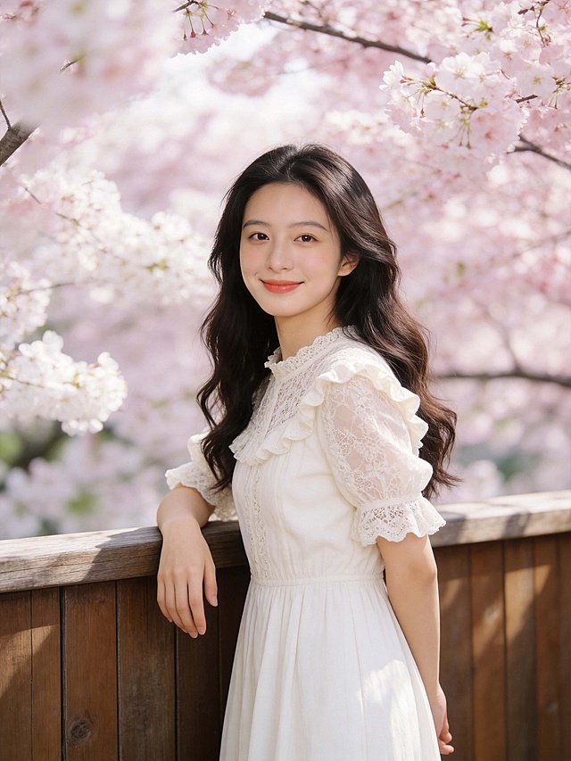 一位年轻女子的上半身特写,她有着棕色的长直发,刘海整齐地垂在额前,发丝被风吹起,显得轻盈飘逸。她穿着一件浅色的针织开衫,内搭白色的衣服,嘴角微微上扬,眼神温柔而清澈,带着一丝腼腆的微笑。她的右手轻轻搭在开衫的肩带上,姿态自然放松。背景是一片盛开的樱花树,粉色的樱花层层叠叠,绚烂夺目,阳光透过花瓣洒下,形成斑驳的光影效果,整个画面充满了春日的浪漫与温馨。照片采用了柔和的自然光,光线明亮而不刺眼,色彩饱和度适中,色调温暖。浅景深效果突出了人物主体,背景的樱花被虚化,呈现出朦胧的美感。整体风格清新自然,充满了少女的甜美与纯真。详情