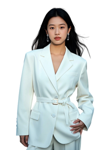 现代都市背景下,优雅女性身着米白西装,与群犬共处街头,融合商务感与清新自然,光影交错间展现科技感与真实质感的3D风视觉。