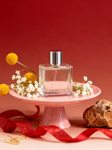玻璃风香水瓶置于粉色托盘,搭配金属盖与柔美花卉,红丝带点缀,呈现优雅浪漫的节日氛围。