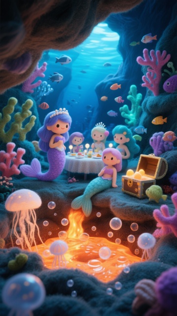 梦幻感与甜美感交织的软3D插画风,卡通美人鱼栖于贝壳中,毛发生长风点缀珊瑚海景,虚拟自然与粘土质感共融,营造童话海洋世界。