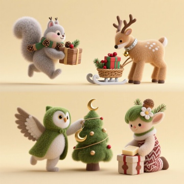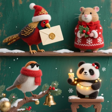 1.戴黏土圣诞帽(帽顶毛球)的土拨鼠,爪握黏土信封(压雪花纹),蹲坐拾爪轻拍信封,身体鼓胀呈圆润质感2.浅棕树懒身着红底白点黏土裙(裙摆带毛边),颈系黏土绿丝带,双手捧着黏土松枝(缀红黏土浆果),慢动作歪头露小牙