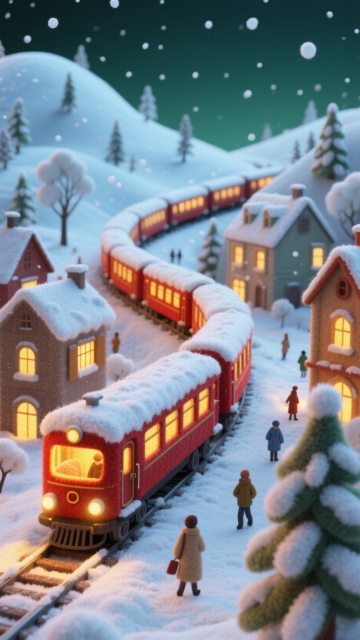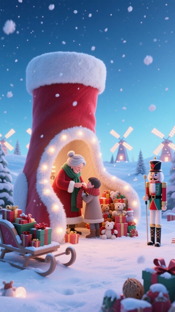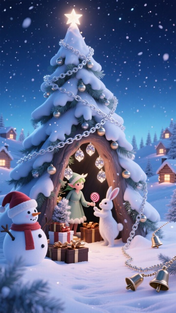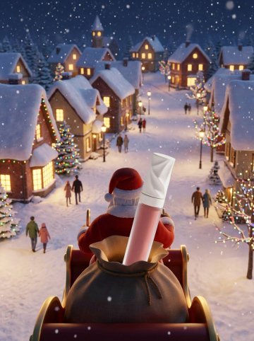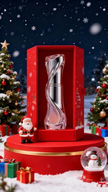 梦幻雪夜圣诞场景,3D微缩艺术风呈现温馨喜庆氛围,塑料质感唇釉置于雪橇之上,搭配玻璃感礼盒与发光彩灯,营造可爱趣味的虚拟现实节日美学。