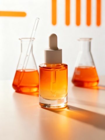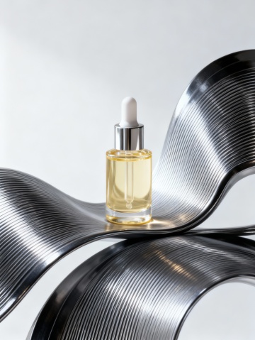 产品置于透明镜面展示台,台面对瓶身、玻璃道具形成清晰倒影,强化了画面的镜面质感与空间层次。背景采用浅蓝与白色融合的低饱和度纯色背景,色调柔和统一,无多余装饰,为玻璃元素提供干净的展示基底;辅助道具有透明玻璃烧瓶、细长玻璃滴管、圆形玻璃球,均为高透玻璃材质,体现纯净的玻璃质感;