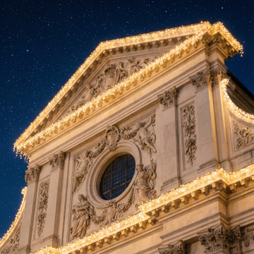 一尊古典风格的白色大理石雕塑,描绘一位优雅的女性和一个长着翅膀的小天使。女性身着飘逸的长袍,右手轻触下巴,姿态端庄娴静,小天使依偎在她身旁,侧脸贴近她的脸颊,神情亲昵可爱。雕塑放置在一个带有深色大理石纹理的圆形底座上,背景是明亮的黄色墙壁和一扇带有彩色玻璃和格栅的深棕色木门,光线柔和地洒在雕塑上,凸显出大理石细腻的质感和精致的雕刻细节,整体氛围宁静而富有古典韵味。