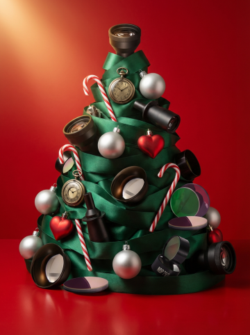 复古科技圣诞树,绿丝带缠绕金属镜头与怀表,3D重拟物拼贴风,极繁主义装饰,喜庆红背景,金属塑料质感交织,节日氛围浓烈。