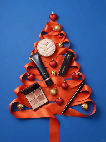 红蓝撞色圣诞树造型,以丝带拼贴构建节日框架,YSL彩妆点缀其间,融合鎏金饰物与金属质感,奢华喜庆中透出时尚张力。