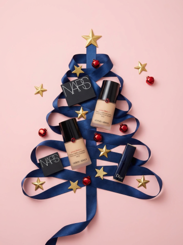 拼贴风圣诞树造型,以丝带与彩妆构建节日构图,融合轻拟物与面料质感,营造喜庆温馨的时尚氛围。