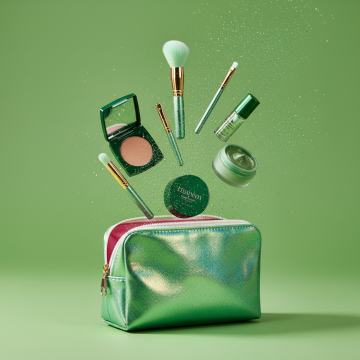 圣诞树造型的彩妆拼贴,红绿双色设计,丝绒质感与金属光泽交织,营造奢华喜庆氛围,浪漫唯美中透出时尚感。