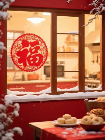 透过中式花窗展示屋内温馨场景,一家人围坐餐桌,桌上热气腾腾的饺子散发暖光,窗外雪花飘落,窗玻璃带有朦胧呵气与积雪,配色以绛红、暖橘、赭石为主色调,低饱和靛蓝平衡画面,主题字“冬至”融入毛绒肌理,整体呈现柔软温暖的节日氛围