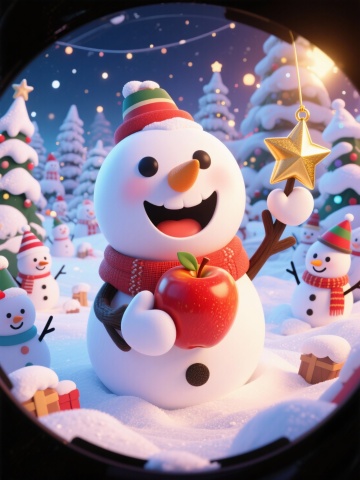 软3D风格雪人萌趣拟人,手持礼物盒,圣诞氛围温馨梦幻,红绿配色喜庆可爱,雪花飘落间尽显节日温暖。