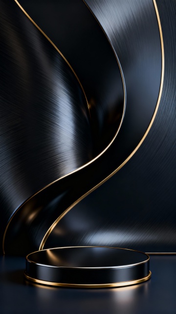 以纯黑色为背景,金色线条构成流畅飘逸的波浪形态,线条呈现出细腻的拉丝质感与鎏金立体效果,底部以金色立体几何建筑剪影为点缀,整体营造出高端大气、简洁而富有动感的视觉氛围,光影上金色线条带有微弱的高光反射,增强立体感与奢华感。