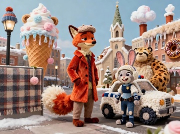 软3D风卡通场景,拟人动物角色穿毛绒服饰,毛发生长质感细腻,甜品建筑与针织元素交织,营造温馨甜蜜的冬日节日氛围。