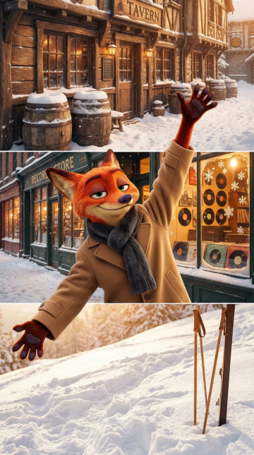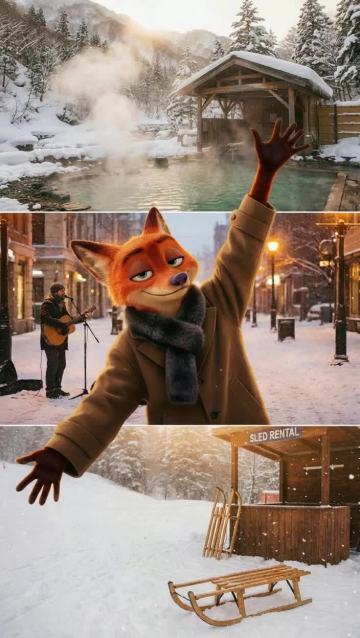 卡通感拟人狐狸在雪镇街头挥手,3D风与虚拟现实结合,油画质感渲染冬日暖意,节日氛围浓厚。