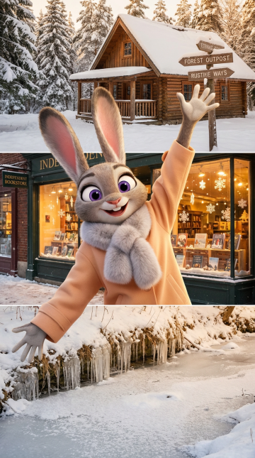 卡通感与软3D风融合,拟人化兔子在冬日小镇中欢快挥手,光影柔和,营造温馨梦幻的节日氛围。