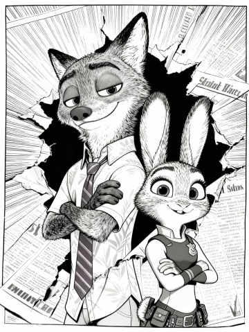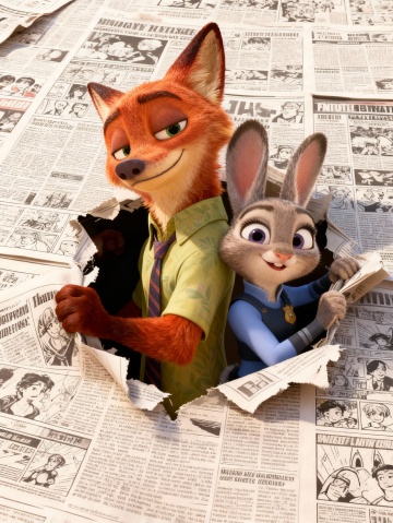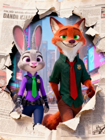 卡通感十足的3D拟人动物警官,撕纸风拼贴背景,融合城市街景与报纸碎片,营造出趣味十足的节日氛围。