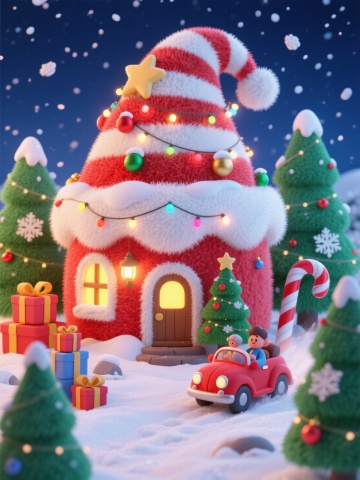 软3D风圣诞小屋,毛发生长质感搭配卡通人物与糖果元素,营造梦幻喜庆氛围,微缩艺术感十足,节日温馨可爱。