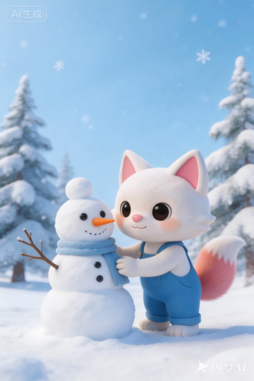 软3D风格萌猫与雪人互动,拟人化表情温馨可爱,梦幻雪景烘托冬日童话氛围。