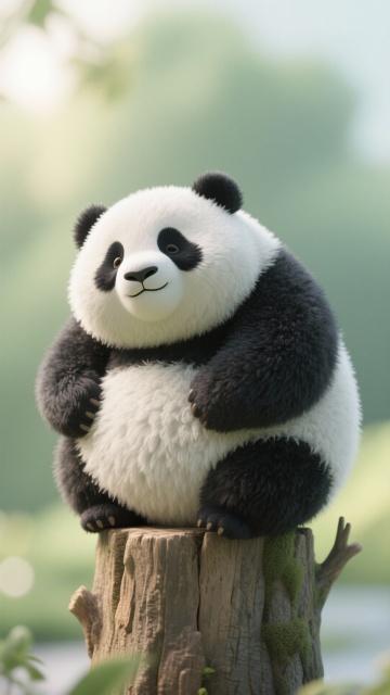 软3D风格的可爱熊猫,毛发生长细腻逼真,卡通感十足,静坐树桩之上,营造温馨自然氛围。