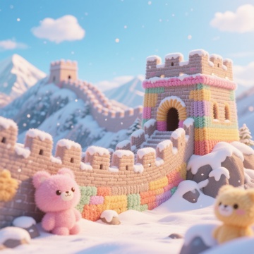 梦幻感十足的软3D风格长城,融合刺绣风与毛发生长质感,可爱卡通小能点缀雪景,节日氛围温馨治愈。