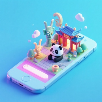 软3D风格的微缩艺术场景,熊猫与传统建筑在手机屏幕上梦幻呈现,融合科技感与卡通感,清新柔和,充满可爱气息。