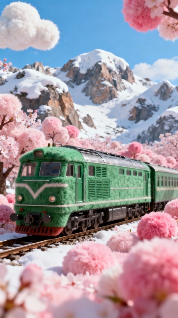 梦幻3D风列车穿行于毛发生长的樱花雪境,软萌质感融合虚拟自然,清新唯美浪漫之旅。