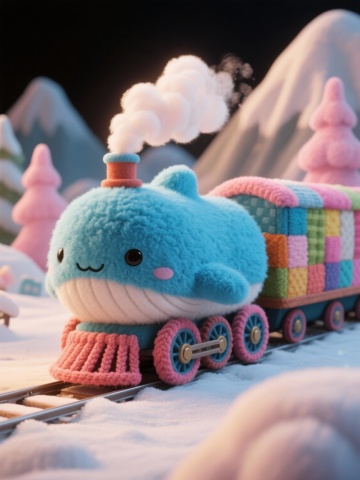 软3D风格的毛绒鲸鱼火车,拟人化设计萌趣十足,搭配针织质感车厢与雪景,营造梦幻温馨的冬日童话氛围。