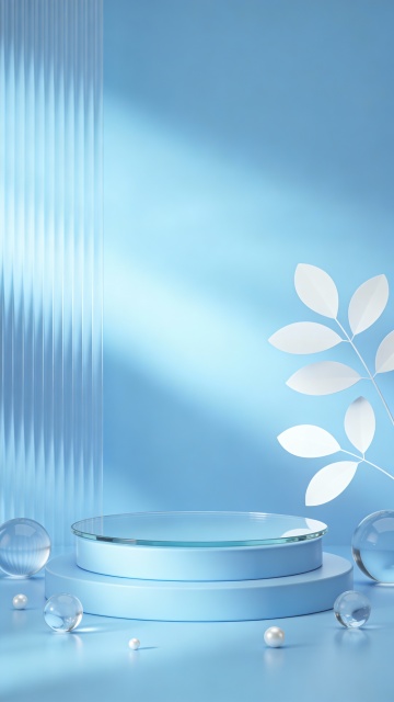 极简主义3D渲染风格,画面中心为一个光滑的圆形金属展示台,台面边缘有细微的反光高光,底部呈现柔和的弧形过渡,保持原有的简洁几何形态。背景采用虚化的光斑效果,光线从上方散射下来,在台面和地面投射出柔和的阴影和光线纹理,营造出宁静优雅的氛围。整体色调变换为纯净的冰蓝色调,展示台呈现出冷冽的金属光泽,背景光斑为浅蓝与白色的渐变,光线阴影呈现淡青色,保持与原图一致的光影层次感和材质质感,突出清冷高级的视觉感受。