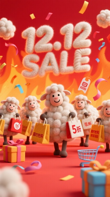 毛茸茸的3D数字“1212”悬浮夜空,搭配闪耀星星与礼物盒,营造梦幻喜庆氛围,重拟物风格强化体积感与膨胀效果,传递双十二狂欢购物节的极致视觉体验。