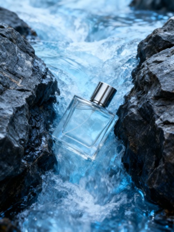玻璃风瓶身置于清冽溪流,液态光影交织,静谧自然中透出清爽与清透感,虚拟与实景交融,如夏日沁凉之息。