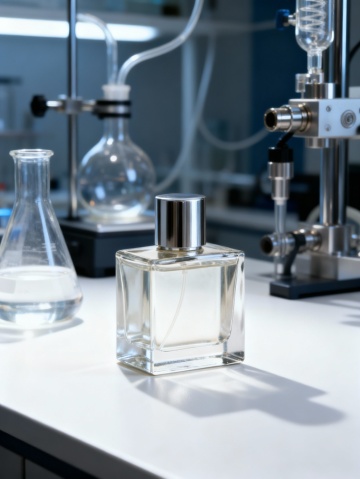 实验室主题产品摄影,橙色精华瓶(白盖滴管),后面远景是两个盛有橙色液体的锥形瓶、其中一个插着玻璃移液管。**高饱和科研光**,液体呈现通透的橙色光泽,玻璃器皿反光锐利,背景为有几个橙色条纹点缀的白色墙面。8K,色彩鲜明,实验台场景真实感,场景带和谐的轻微橙光。