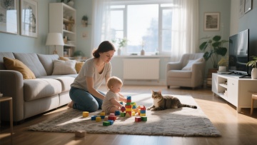 电影感温馨客厅三宫格,艺术摄影。 **场景:** 温馨客厅,暖棕与米白色渐变,有柔软沙发、地毯。光线柔和朦胧,带有胶片质感。 **主角:** 一只漂亮的蓝猫(俄罗斯蓝猫),拥有灰蓝色柔软毛发,眼睛明亮有神。 **氛围:** 温暖、幽默、俏皮、充满故事性。猫咪显得好奇、聪明且带有一丝调皮。 **布局:** 横向三宫格,三张连贯的图片。 **风格:** 艺术写真,电影感,浅景深,柔焦,高细节。