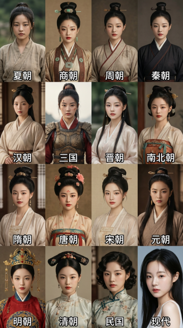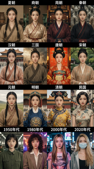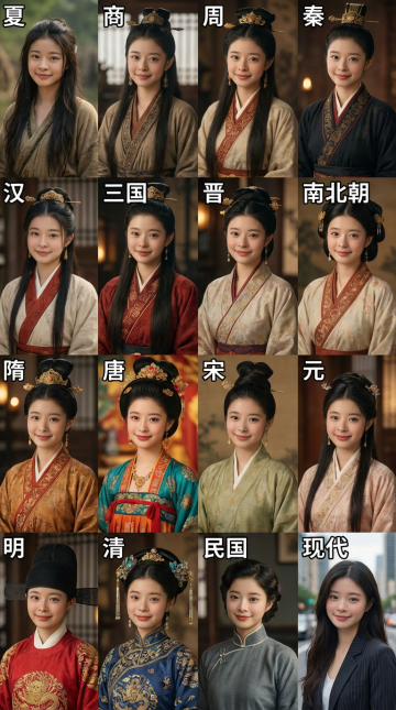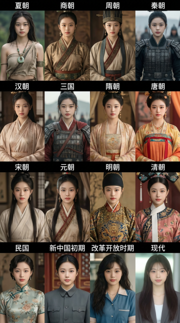 制作一个4×4的16宫格,从夏朝开始至今,在每个格子中,图中人物的形象都应该符合该年代的风格(服装、发型、配饰),以中文标注时间,背景是电影风格