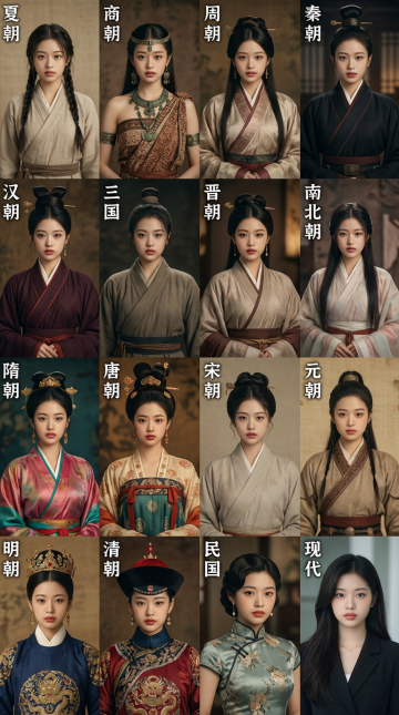 古典感与中式美学交融,实景质感呈现中华千年服饰演变,工笔风与刺绣风细节精致,光影柔和,复古优雅中透出民族文化的厚重与唯美感。