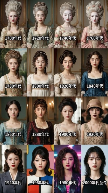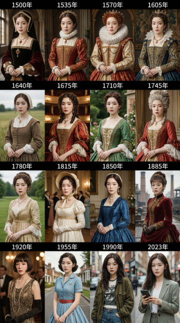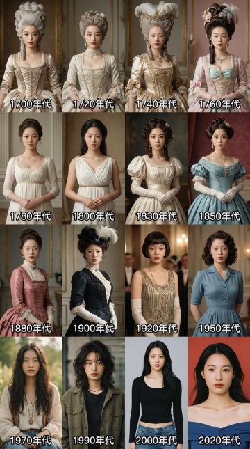 复古感与古典感交织,优雅奢华的欧洲宫廷艺术风贯穿百年时尚演变,重拟物风呈现油画质感,光影细腻,实景感强烈,展现从文艺到现代的潮流变迁。