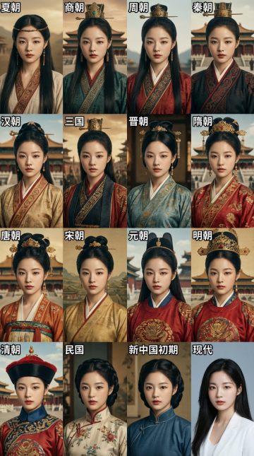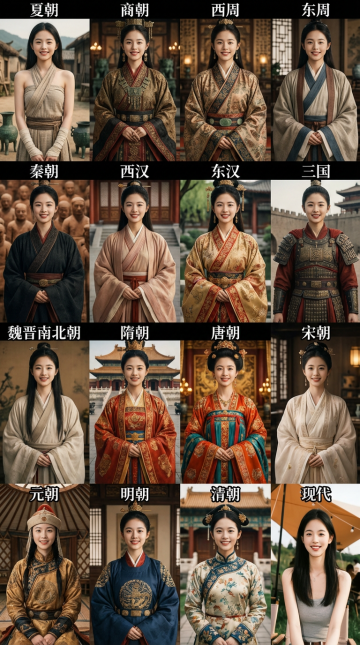 复古感与中式美学交织,工笔风细腻描绘各朝服饰演变,重拟物风呈现真实质感,油画般光影营造优雅唯美氛围,刺绣与面料细节尽显古典韵味。