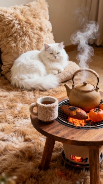 暖意融融的冬日围炉场景,毛绒质感与中式茶炉交织,轻拟物风呈现毛发生长般的柔软触感,面料纹理细腻,营造温馨舒适、质朴自然的实景氛围。