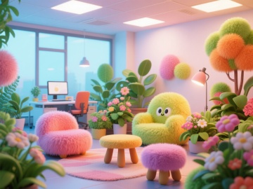 梦幻感软3D风格办公室,毛茸茸家具与虚拟自然融合,卡通化植物生长,营造可爱温馨氛围。