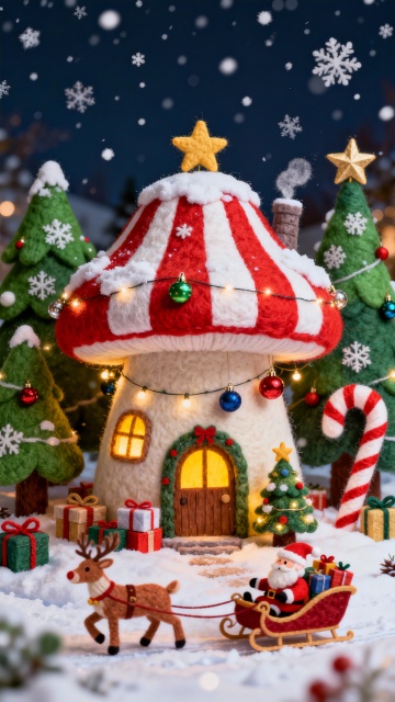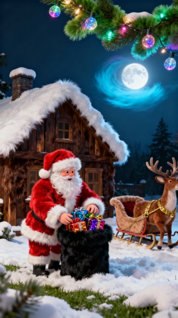 软3D粘土风圣诞场景,萌趣圣诞老人与驯鹿雪橇,搭配梦幻月夜与温馨小屋,营造可爱、喜庆、梦幻的节日氛围。