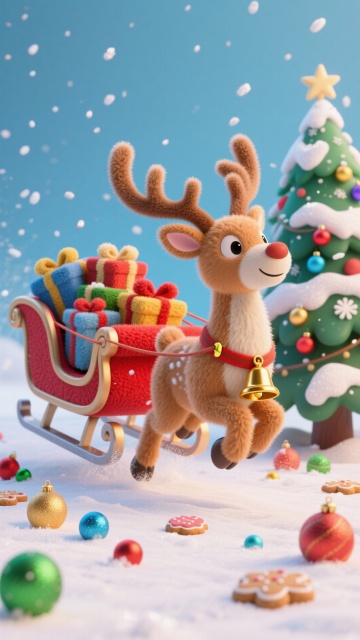 软3D风萌趣驯鹿拉雪橇,毛发生长质感细腻,梦幻雪景搭配喜庆礼物与圣诞树,温馨可爱,节日氛围浓厚。